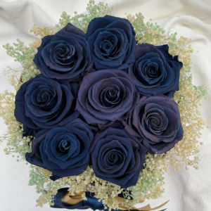 Bouquet Blue Velvet. Bouquet de 8 rosas de color azul terciopelo con corona de flores paniculata en caja de color natural . Dimensiones de la caja 17.2 x 13.0 cms.