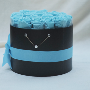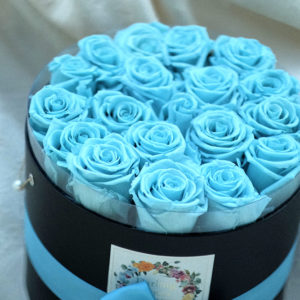 Bouquet Emotion. Bouquet de 18-20 rosas de color celeste en caja de color negro. Dimensiones de la caja 23×19.5 cms