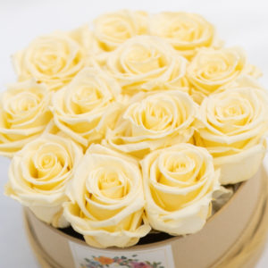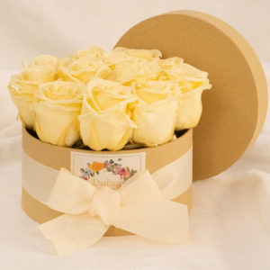 Bouquet Faith, 12 rosas preservadas de color champagne en caja redonda de color marrón claro.