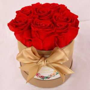 Bouquet Fidelity. Bouquet de 8 o 9 rosas de color rojo en caja de color camel. Dimensiones de la caja 14.7×11.4 cms.