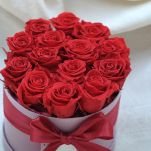 Bouquet For You. Bouquet de 14 rosas de color rojo en caja de color malva. Dimensiones de la caja 19.7×14.5 cms.