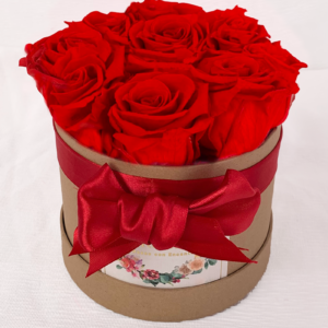 Bouquet Lovely. Bouquet de 9 rosas de color rojo en caja de color camel. Dimensiones de la caja 14.7×11.4 cms.
