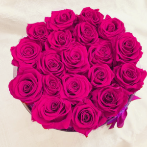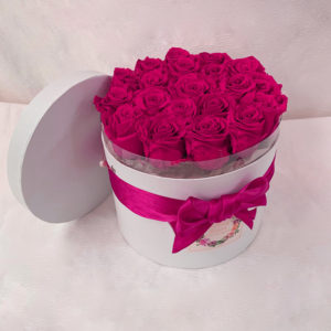 Bouquet Loving You. Bouquet de 18 rosas aproximadamente de color rosa oscuro en caja de color blanco. Dimensiones de la caja 23 × 19.5 cm.