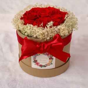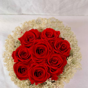 Bouquet My only one. Bouquet de 8 rosas de color rojo con corona de paniculata en caja de color camel. Dimensiones de la caja 17.2 x 13.0 cm