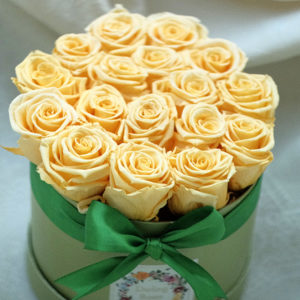 Bouquet Nature. Bouquet de 17 rosas de color amarillo/salmón en caja de color verde. Dimensiones de la caja 19.7×14.5 cm