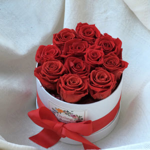 Bouquet Venerate. Bouquet de 11 rosas de color rojo en caja de color perlado. Dimensiones de la caja 17.2×13.0 cm.